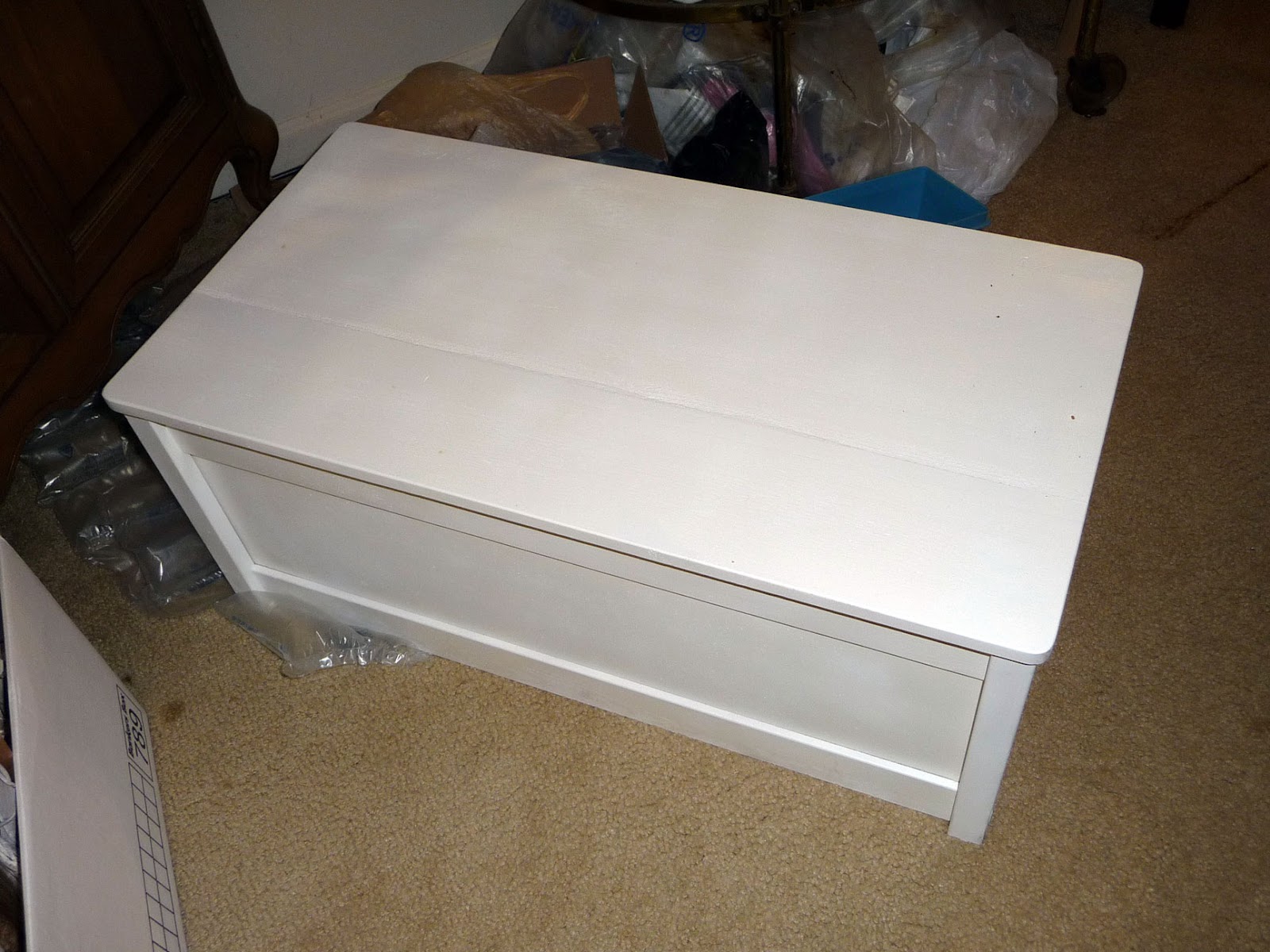 IKEA used to sell wooden storage boxes called "Apa" that could double as benches. I had bought two of them, along with a few cheap pillows, to use as a storage bench for linens at the foot of my bed. Unfortunately, when I upgraded from a double bed to a queen bed the extra length turned the Apa pair from storage bench into choke point moving in & out of my room. Even worse, the oils in the wood made them useless to store linens. Somewhere in my fevered imagination I could clearly see them painted beautifully inside & out, holding scads of my niece's toys & games while also providing surfaces to use either as occasional tables or seating (even a 100+ lb adult could sit safely on one of the boxes if they sat gently).