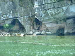 The passing scenery began to demand attention, with karst hills jutting up at odd angles and looking unlike any place I'd been before. Sheets of undulating rock jutted out from the base of many hills where softer minerals had eroded away forming odd shapes that reached right into the water and there were small caves scattered everywhere, making it look like the hills were melting into the river -- which, in hindsight, was exactly what they were doing!